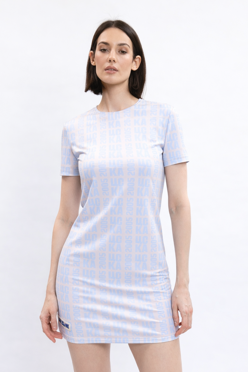 Платье SLIM фасона. Круглая горловина, прямая линия плеч, короткий рукав. На груди- дизайнерский принт "ПФК ЦСКА 2005". Снизу прорезиненная нашивка ЦСКА х DNK. Выполнено из эластичной ткани бифлекс.