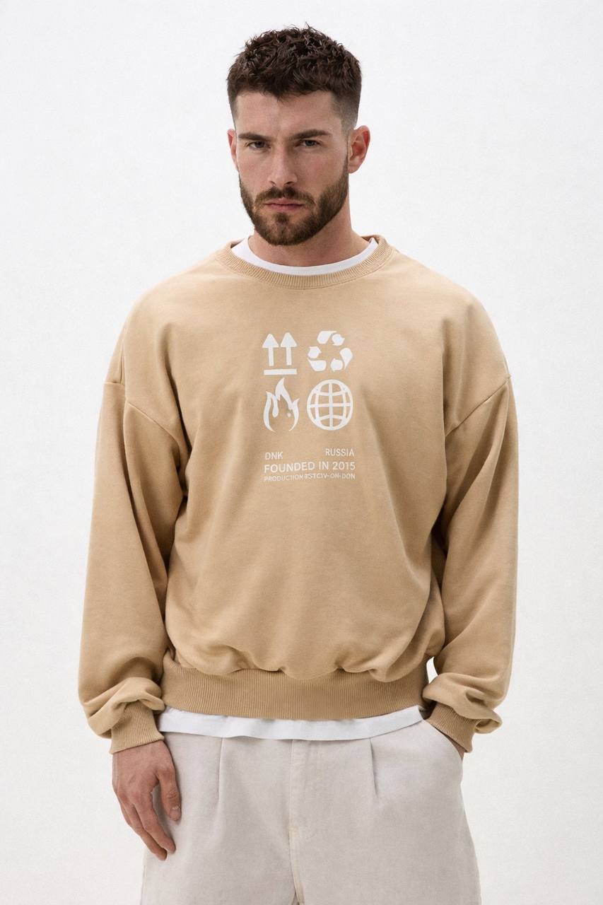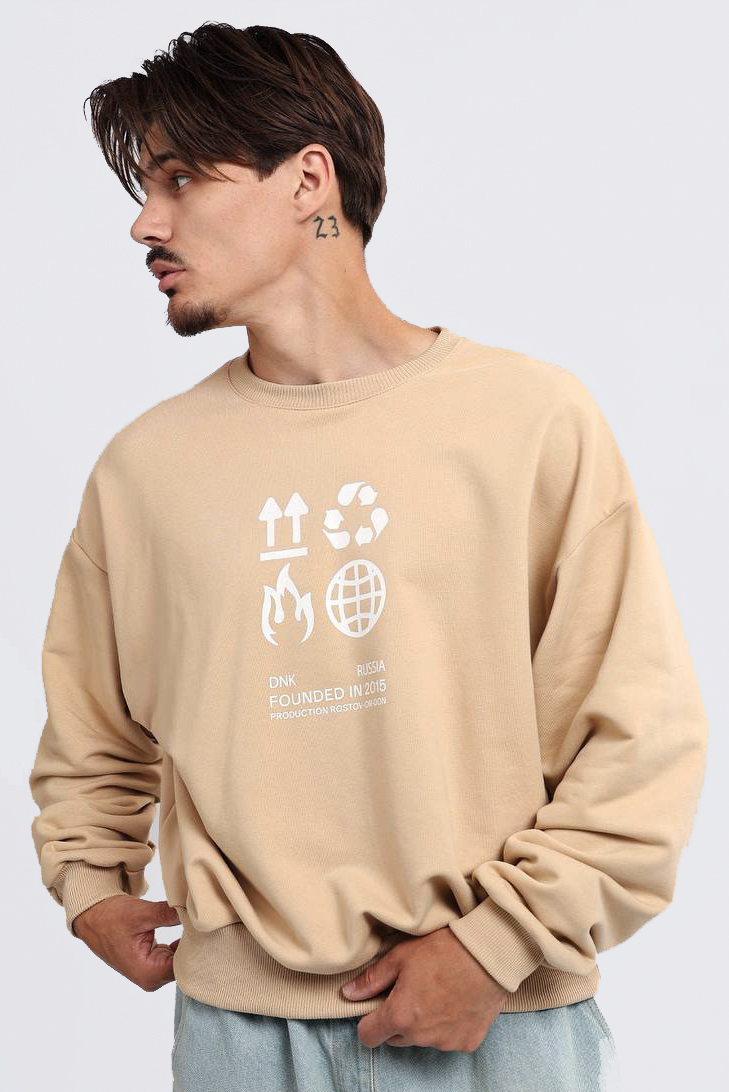 Свитшот свободного кроя. Опущенная линия плеч. Широкие эластичные манжеты. Низ свитшота, манжеты и горловина выполнены в рубчик. На груди - крупный дизайнерский принт . Сзади - фирменная нашивка DNK. Свитшот выполнен из дышащего органического хлопка.
