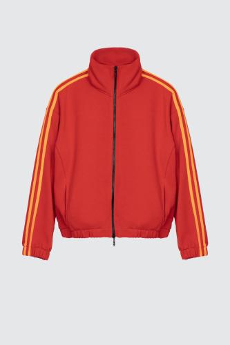 Толстовка свободного кроя. Высокий воротник-стойка. Брендированная застежка-молния. Эластичные манжеты и низ кофты. Два накладных кармана. На рукавах расположены лампасы. Слева на груди прорезиненная нашивка DNK.