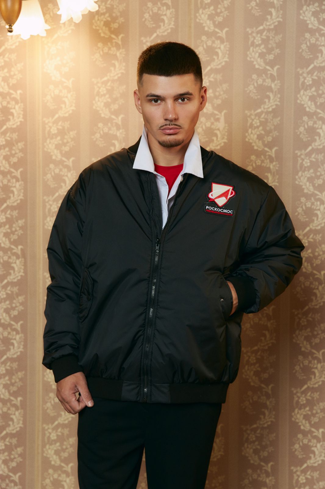 Бомбер свободного кроя. Невысокий воротник-стойка. Брендированная застежка-молния, за которой расположена ветрозащитная планка. Опущенная линия плеч. Объемные рукава с манжетами. Два втачных кармана. Воротник, манжеты, и низ бомбера выполнены в рубчик. Спереди - дизайнерский нашивки РОСКОСМОС. Сзади-фирменная нашивка DNK. Бомбер выполнен из плотной курточной ткани с водонепроницаемой пропиткой. Внутри - шелковистая подкладка. Утеплитель - экоаналог пуха. Температурный режим до - 10C.