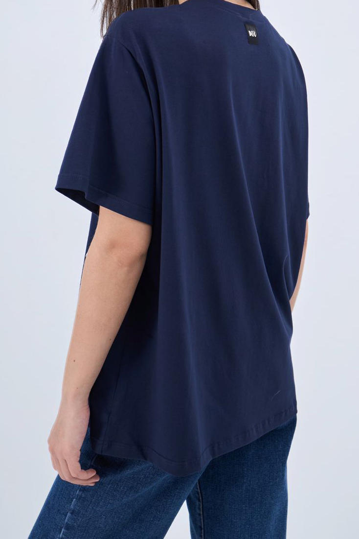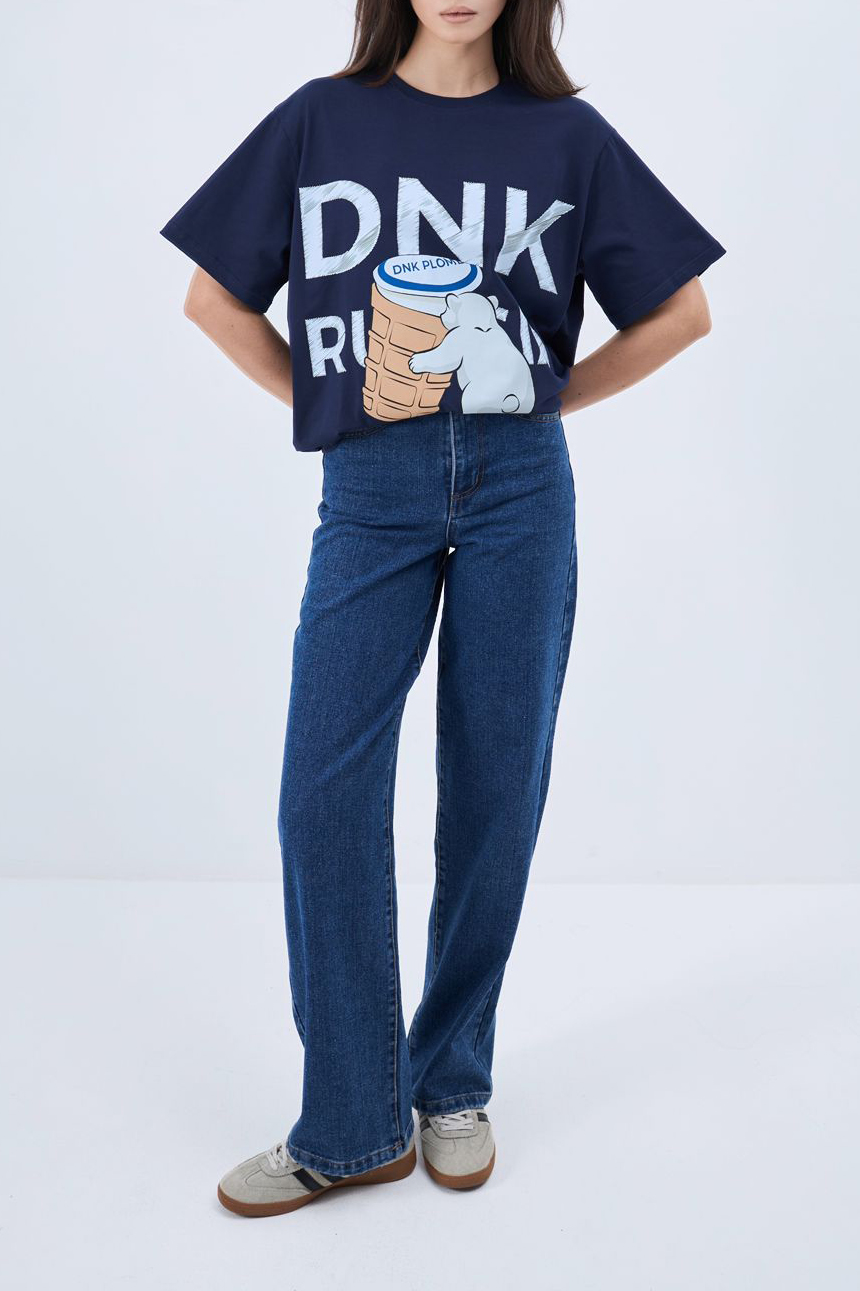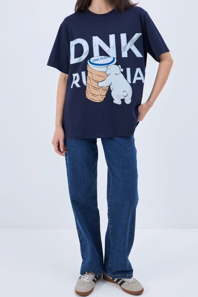 Футболка свободного кроя. Круглая горловина в рубчик. Опущенная линия плеч. На груди - дизайнерский принт DNK . Сзади - фирменная нашивка DNK. Футболка выполнена из дышащего органического хлопка.<br>