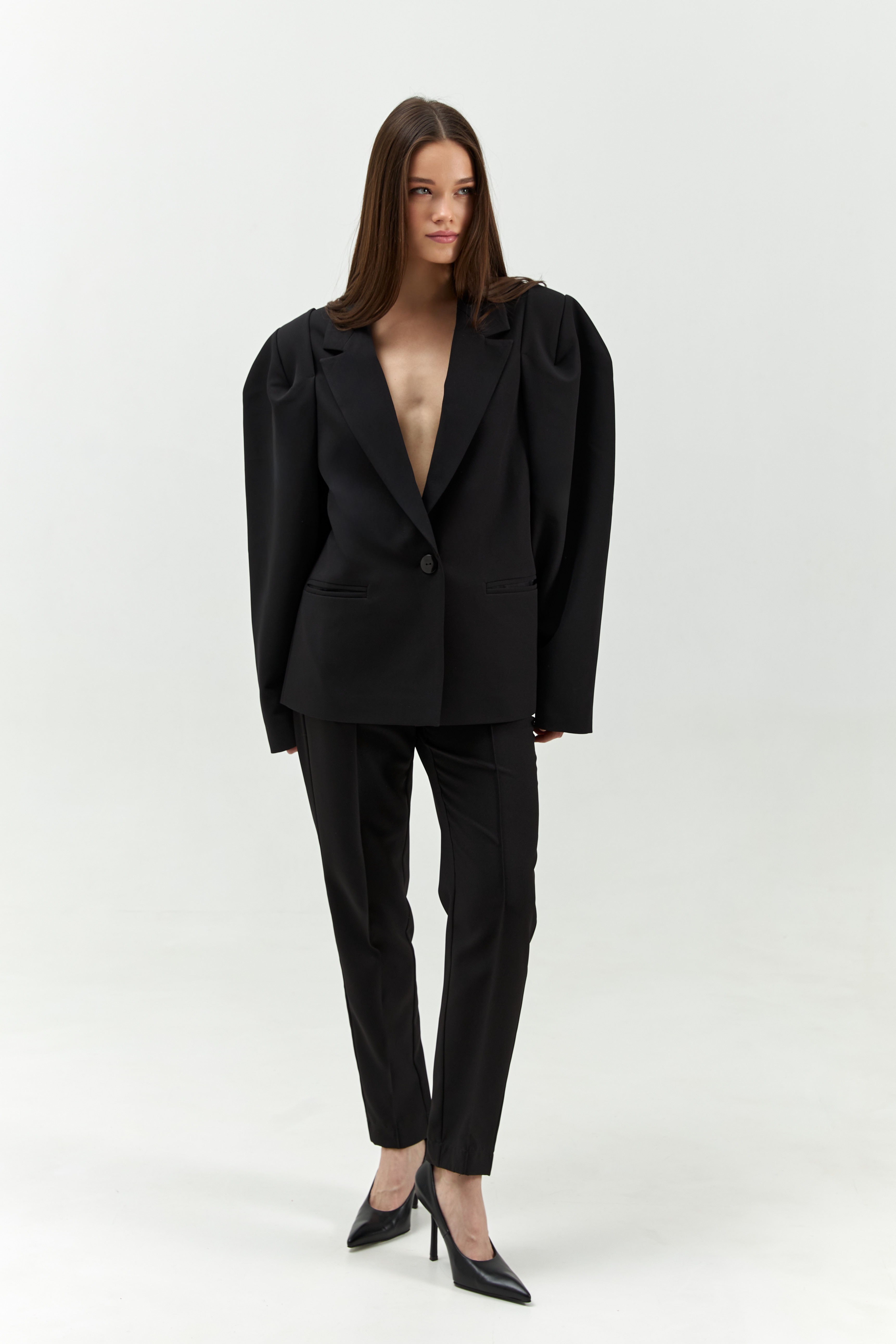 Модель выполнена из премиальной костюмной ткани, которая безупречно держит форму и обеспечивает долговечность изделия.