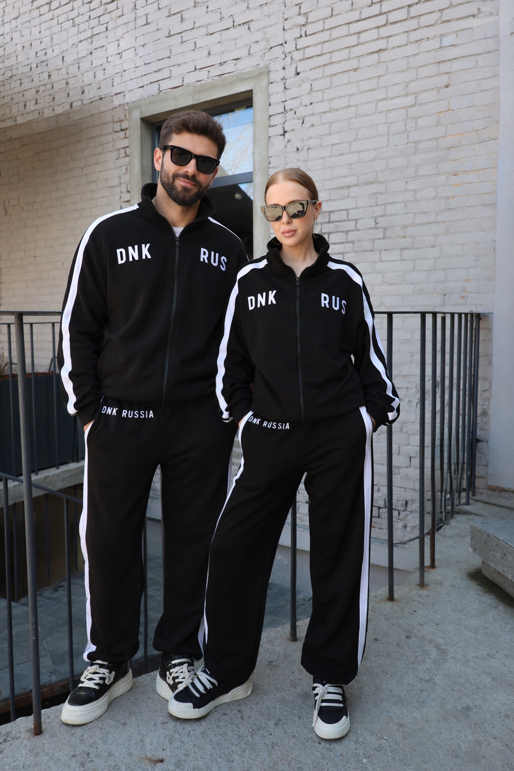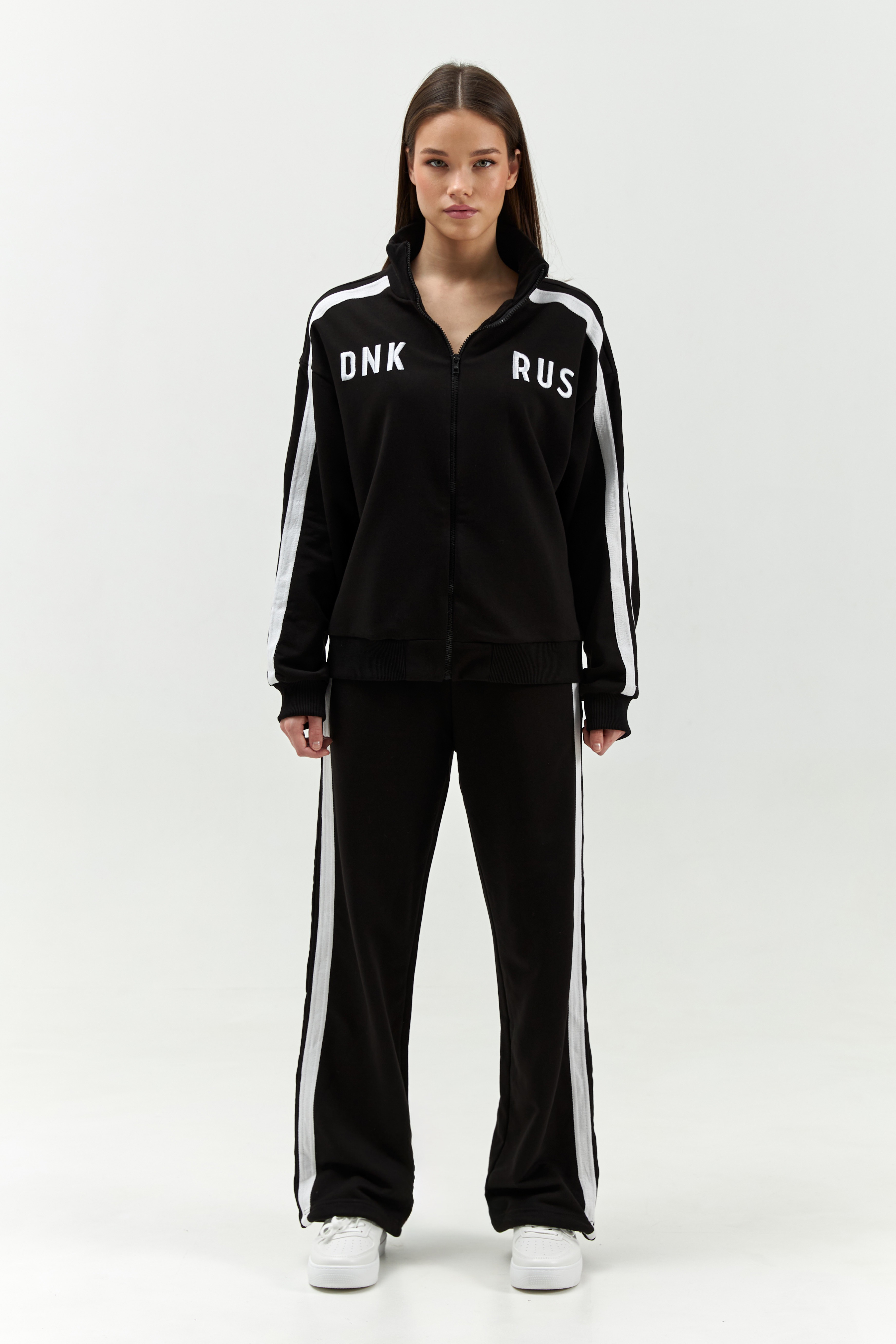 На рукавах двойные лампасы, на груди принт DNK RUS, сзади — фирменная нашивка DNK.