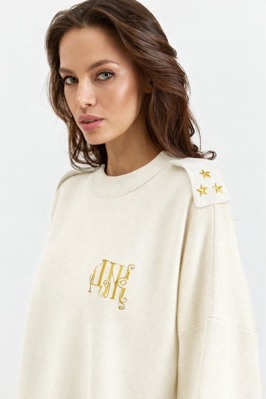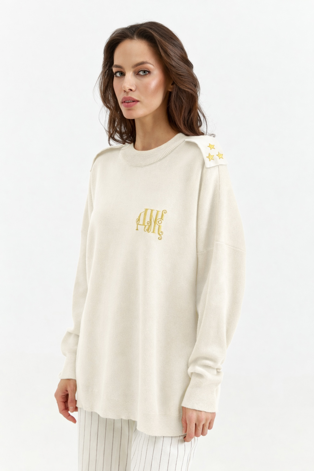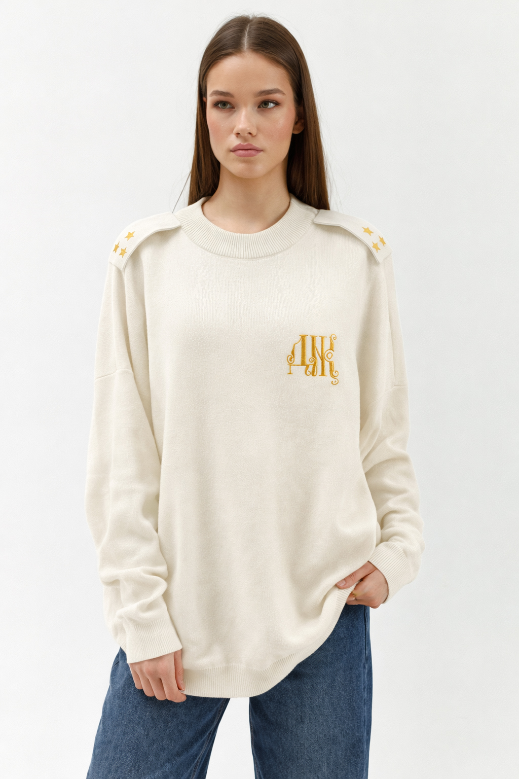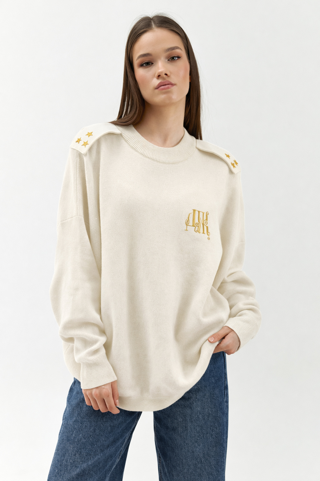 Свитер свободного кроя. Круглая горловина. Опущенная линия плеч. Объемные рукава с манжетами На груди - дизайнерская вышивка DNK . Сзади - фирменная нашивка DNK. Опущенная линия плеч. На плечах авторские погоны.