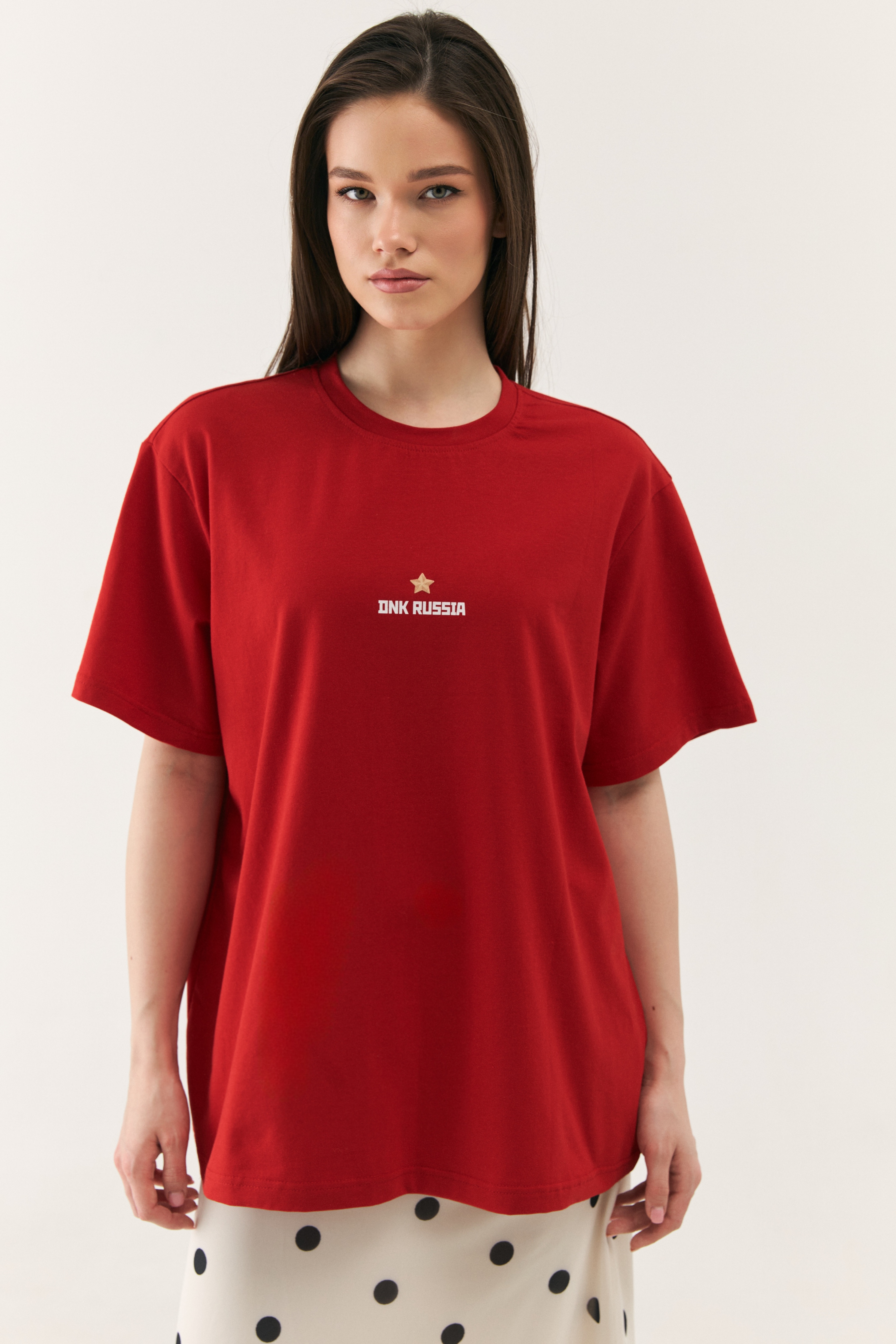 Футболка свободного кроя. Опущенная линия плеч. На груди - дизайнерский принт. Сзади - фирменная нашивка DNK. Футболка выполнена из эластичного органического хлопка.
