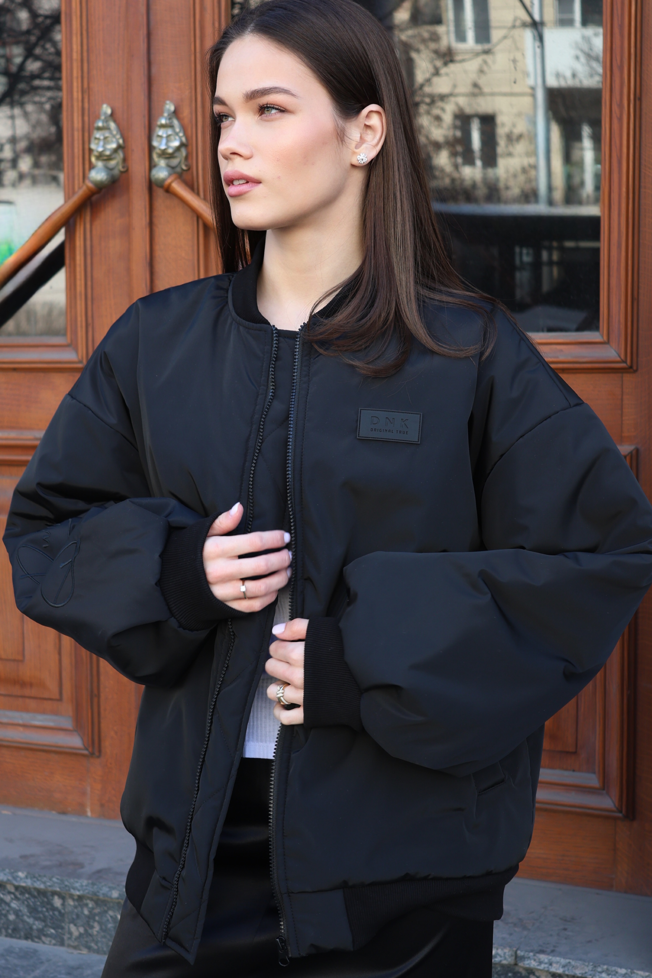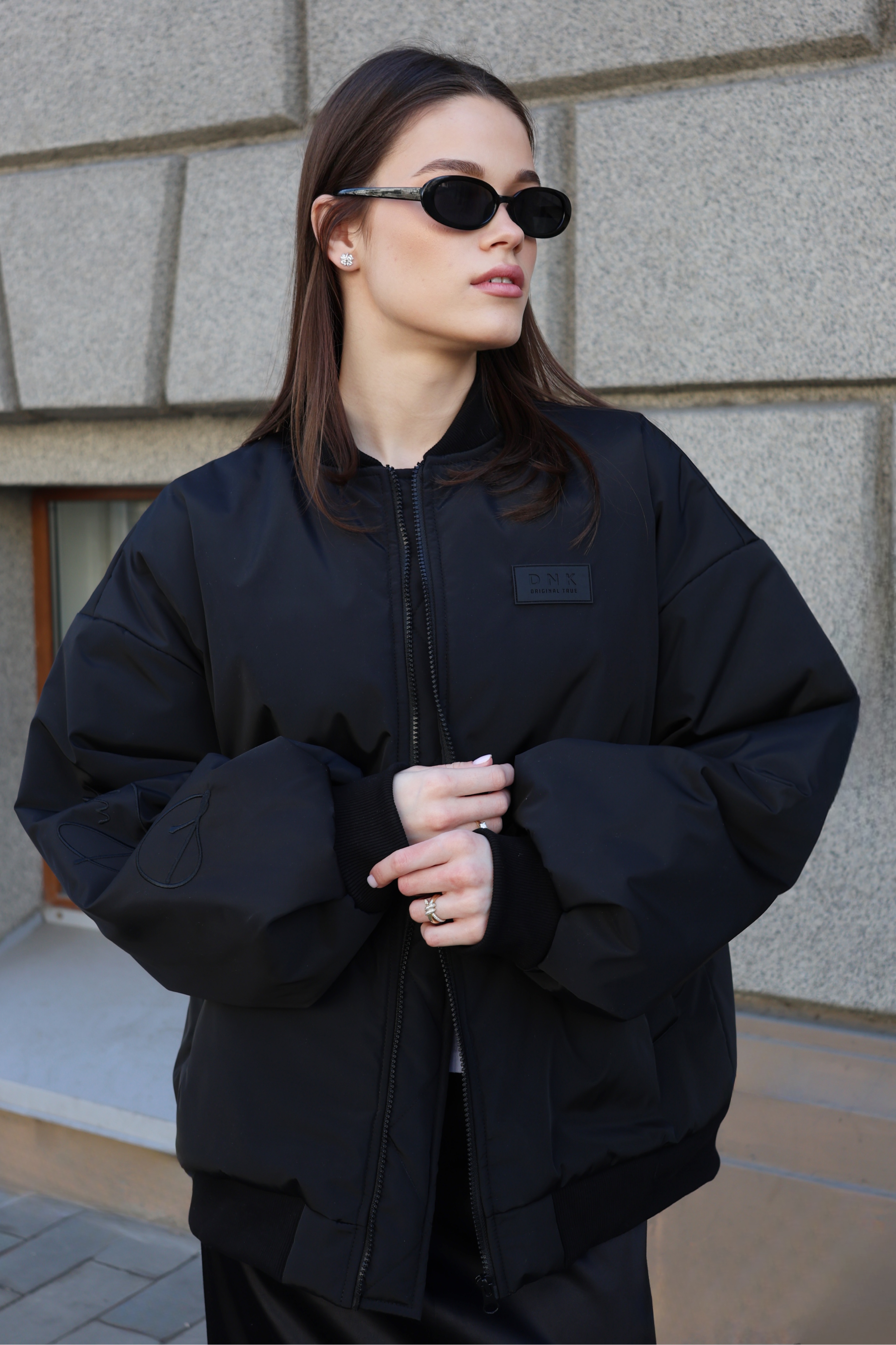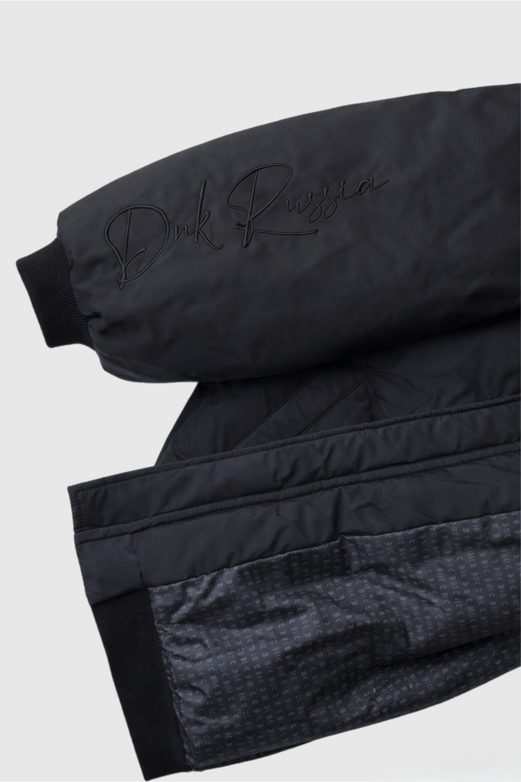 Бомбер свободного кроя. Невысокий воротник-стойка. Брендированная застежка-молния, за которой расположена ветрозащитная планка. Опущенная линия плеч. Объемные рукава с манжетами. Два втачных кармана. Воротник, манжеты, и низ бомбера выполнены в рубчик. Сзади - фирменная нашивка DNK. Бомбер выполнен из плотной курточной ткани с водонепроницаемой пропиткой. Внутри - шелковистая подкладка. Утеплитель - экоаналог пуха. Температурный режим до - 10C.