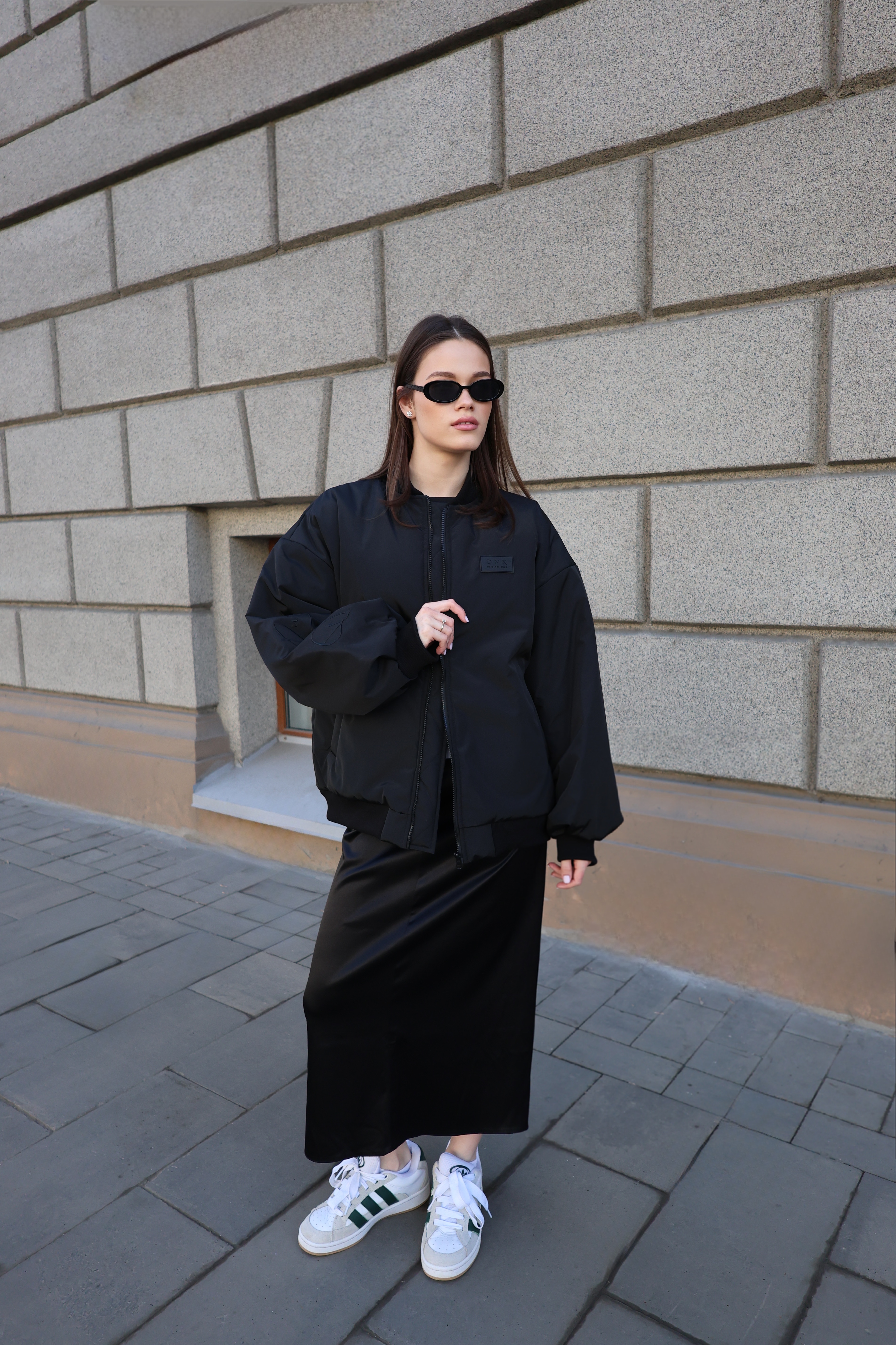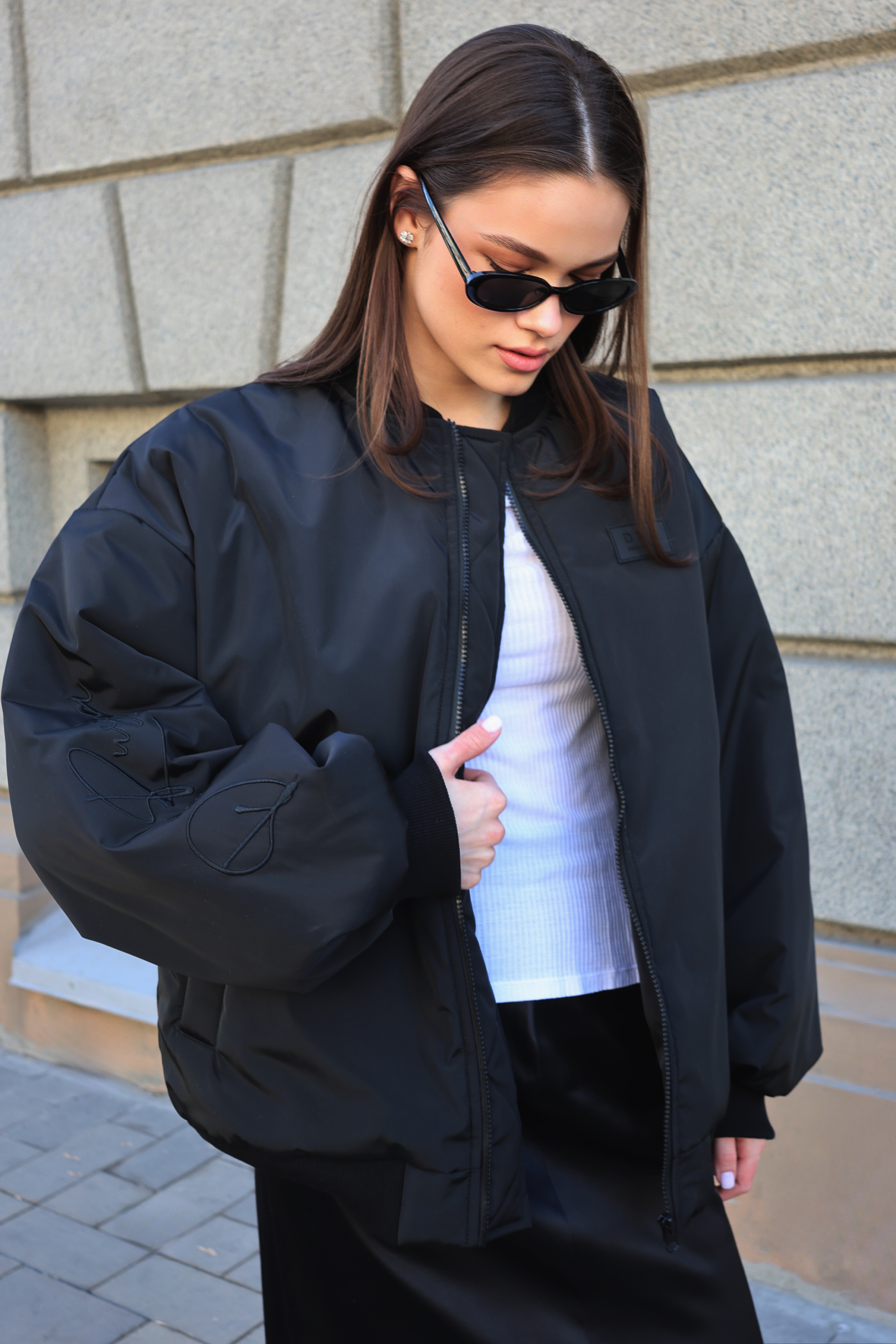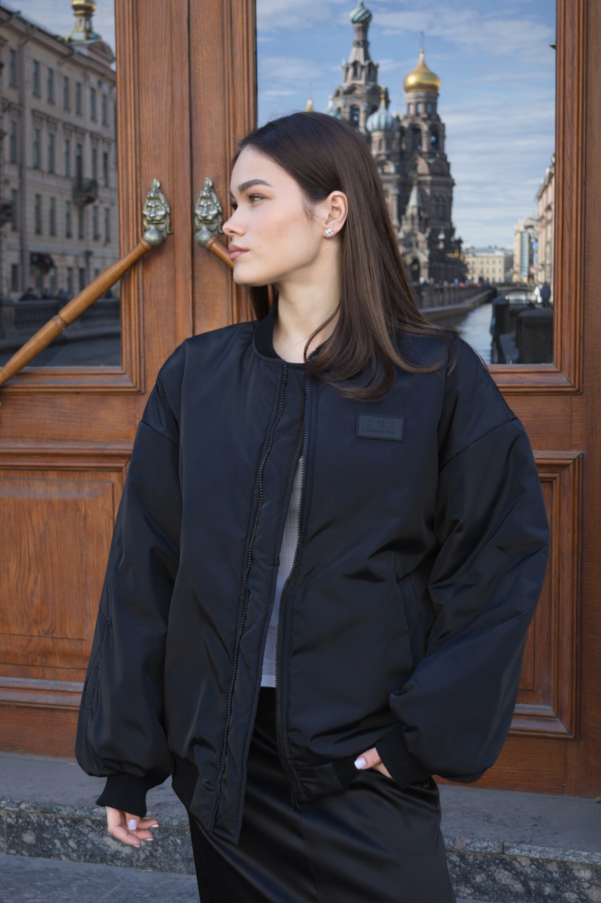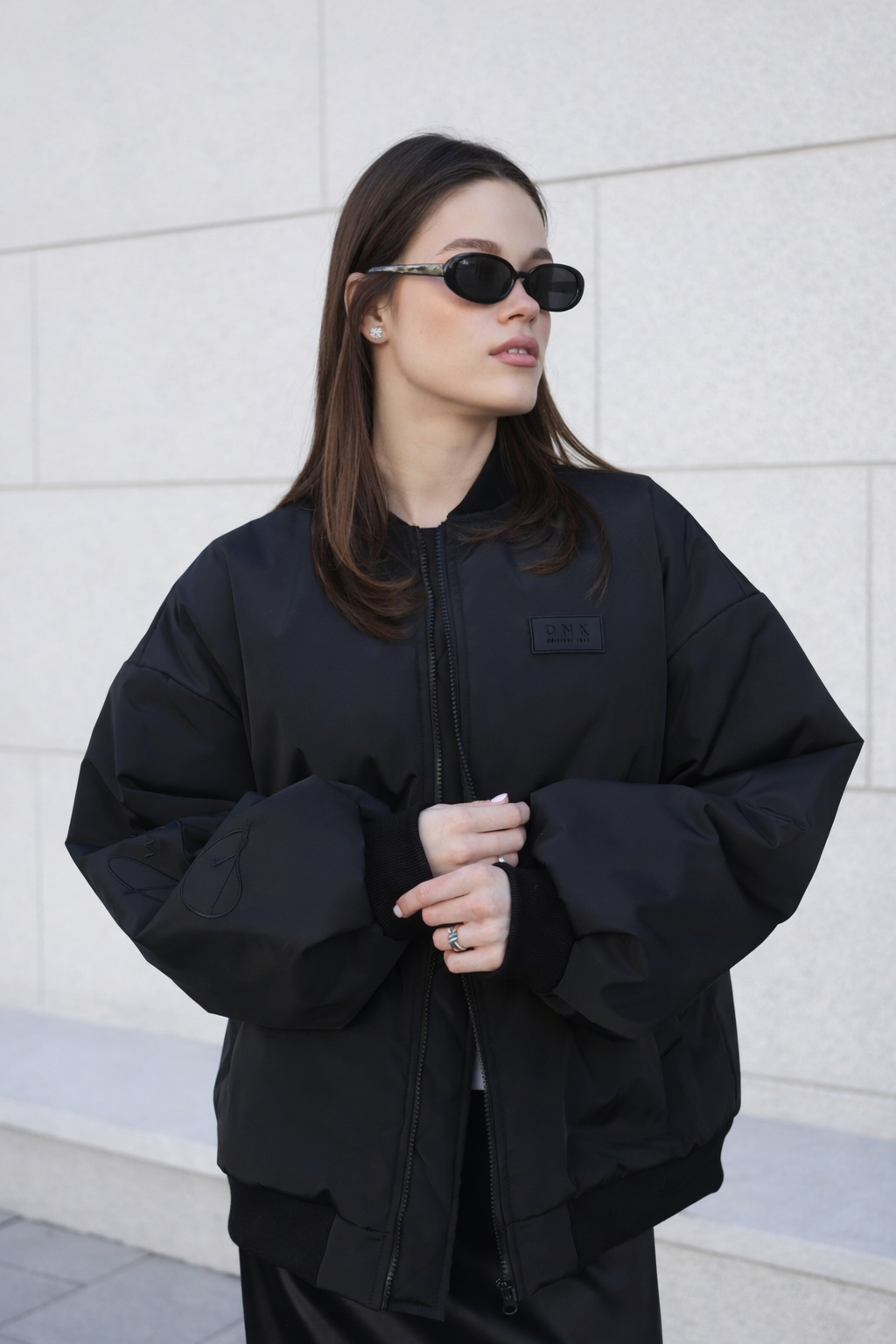 Бомбер свободного кроя. Невысокий воротник-стойка. Брендированная застежка-молния, за которой расположена ветрозащитная планка. Опущенная линия плеч. Объемные рукава с манжетами. Два втачных кармана. Воротник, манжеты, и низ бомбера выполнены в рубчик. Сзади - фирменная нашивка DNK. Бомбер выполнен из плотной курточной ткани с водонепроницаемой пропиткой. Внутри - шелковистая подкладка. Утеплитель - экоаналог пуха. Температурный режим до - 10C.