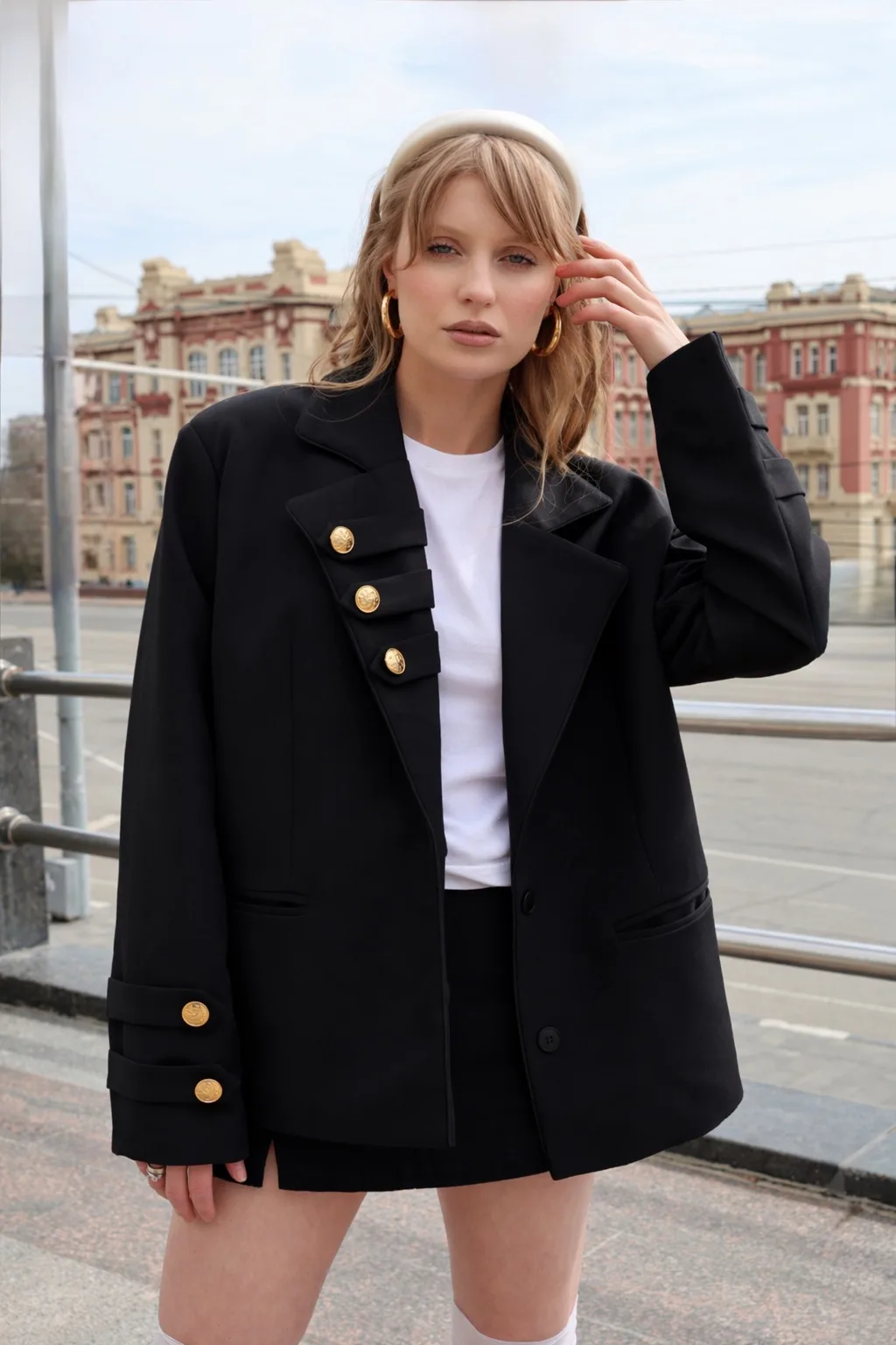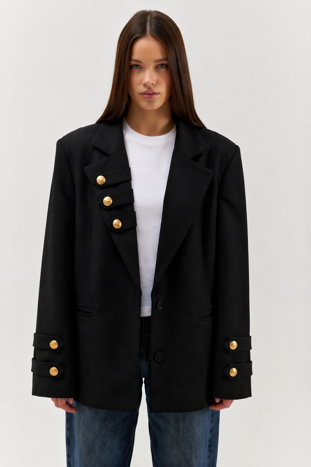 Роскошный пиджак в современном прочтении гусарского стиля. Вдохновленный эстетикой парадной военной формы, он сочетает в себе силу, статус и выверенную декоративность. Гусарские элементы здесь переосмыслены через призму современной моды — сдержанно, графично и предельно актуально.