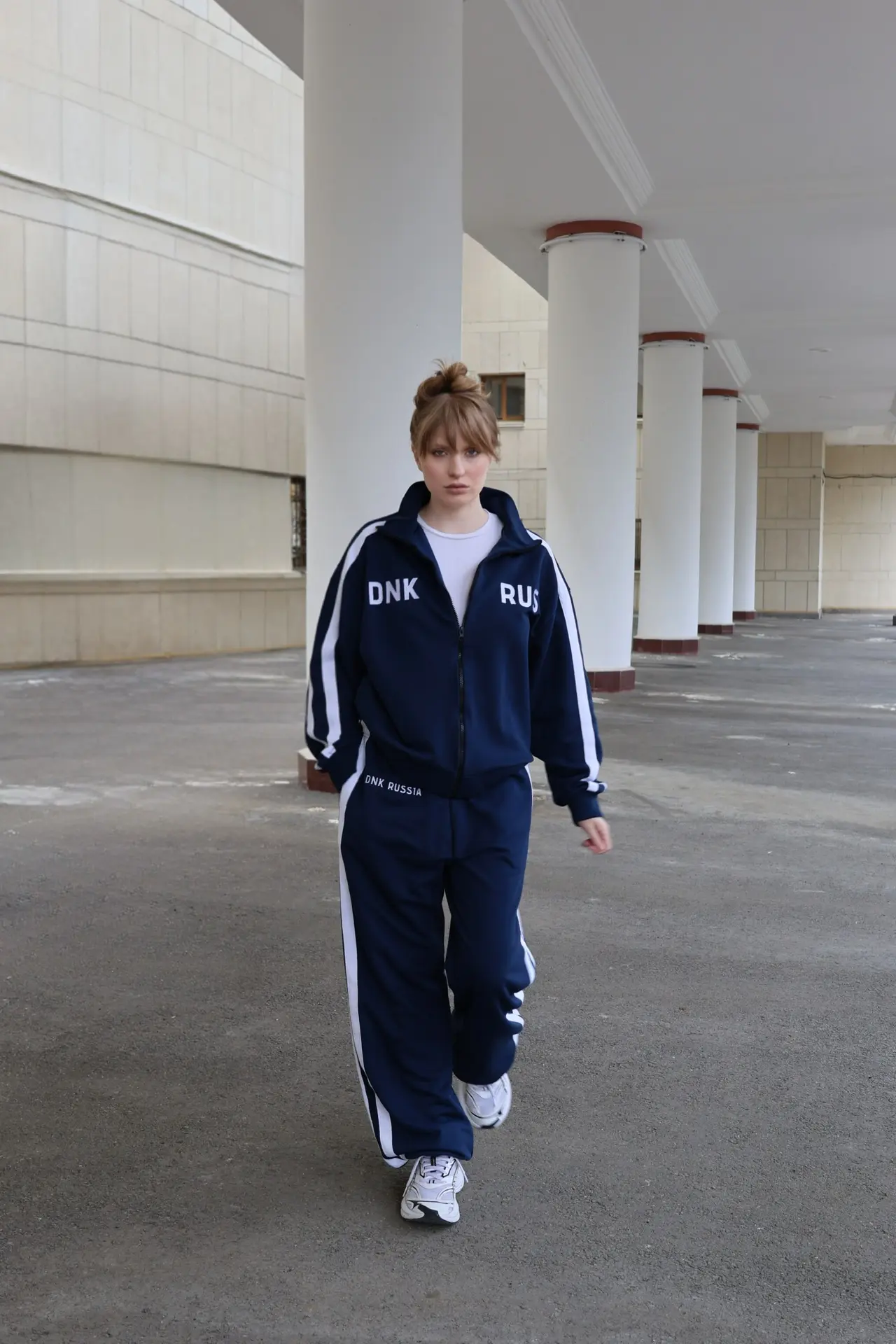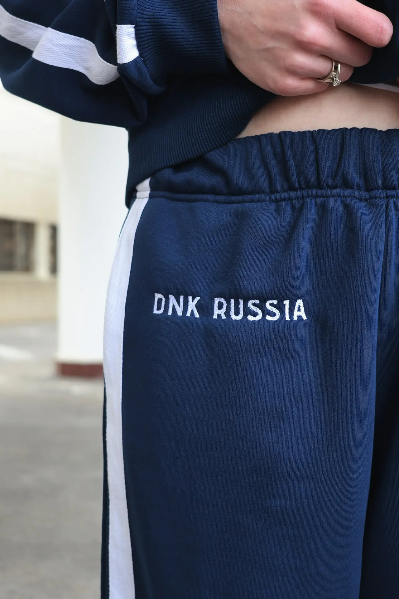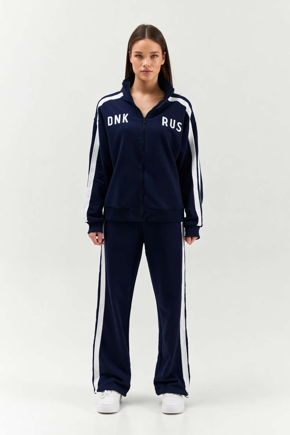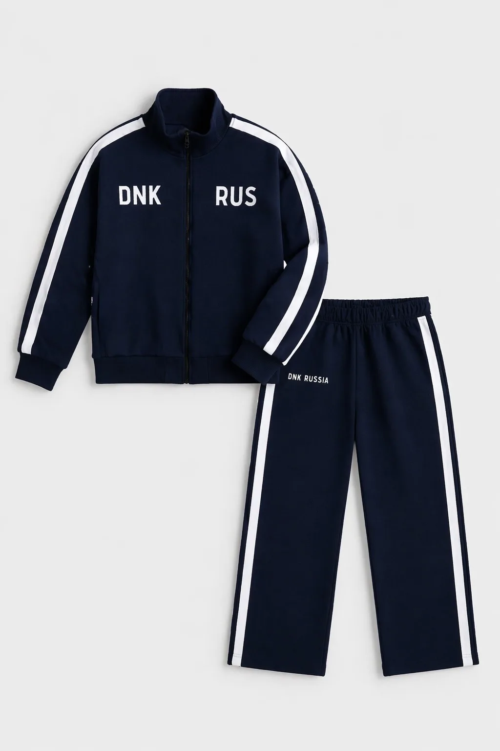 Костюм выполнен из футера трехниточного. Олимпийка на молнии свободного кроя с воротником-стойкой, опущенной линией плеч и объемными рукавами с манжетами. На рукавах двойные лампасы, на груди принт DNK RUS, сзади — фирменная нашивка DNK. Прямые спортивные брюки, при желании низ штанин можно затянуть, превратив их в джоггеры. На эластичной резинке на поясе с карманами и двойными лампасами по бокам.
