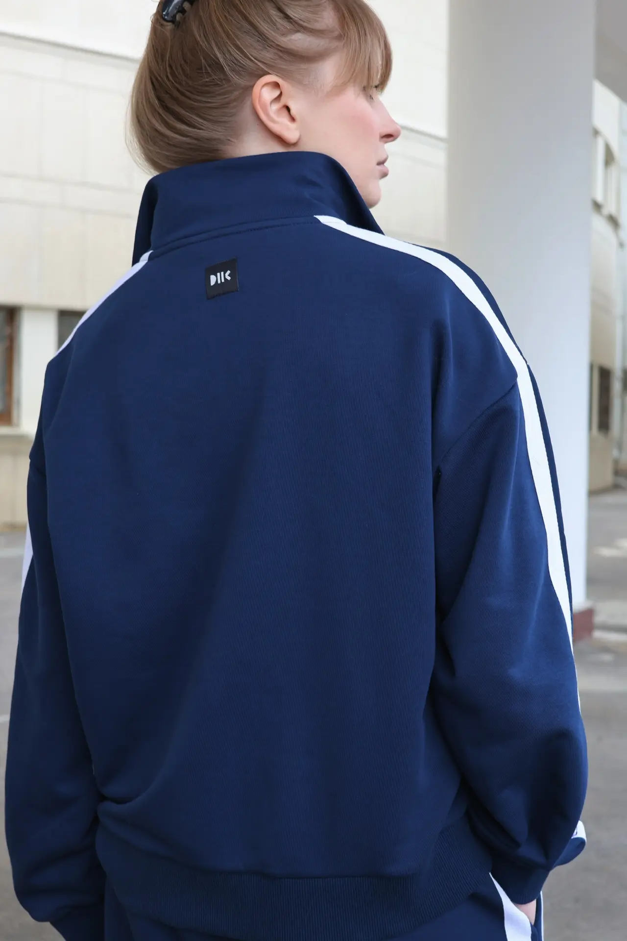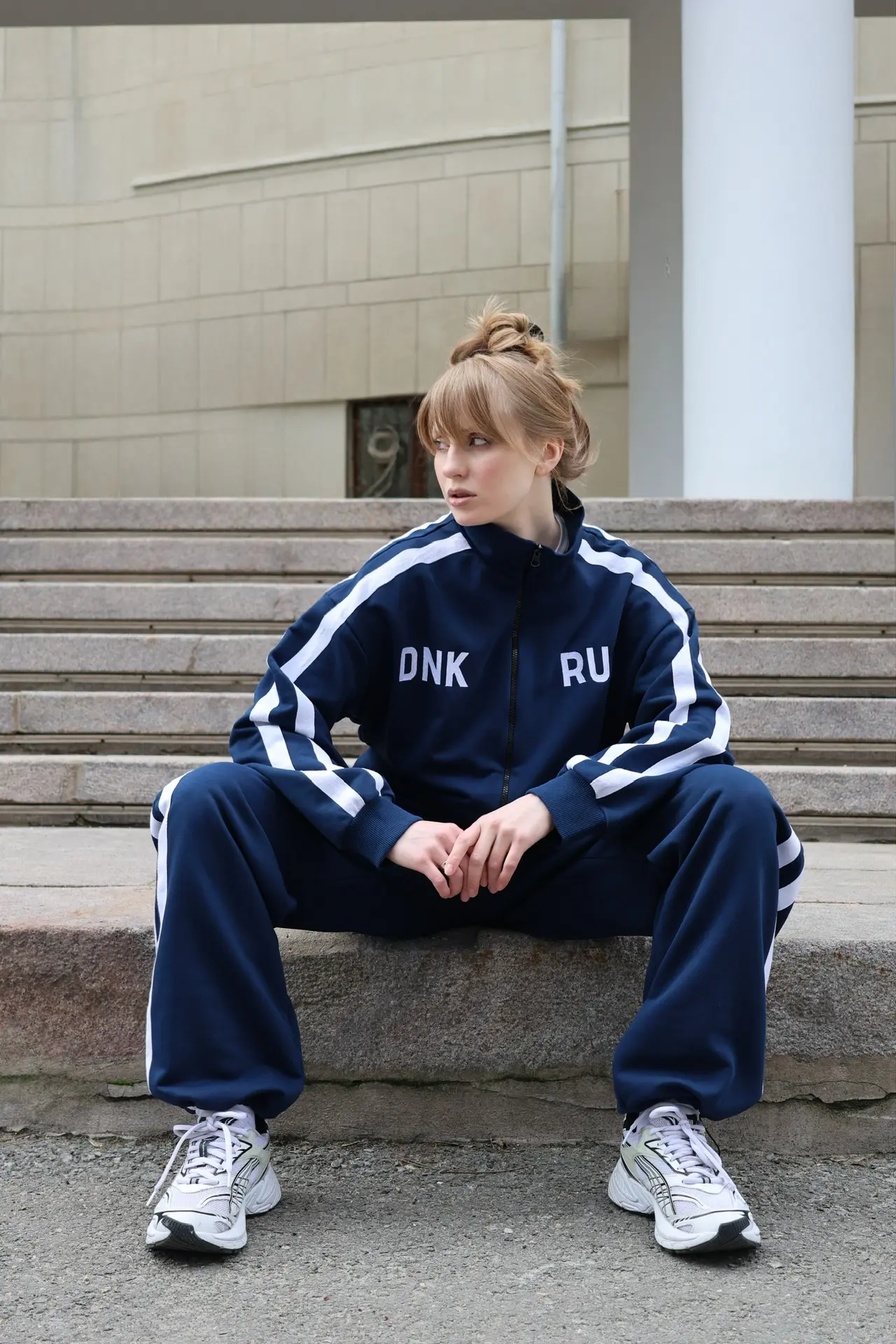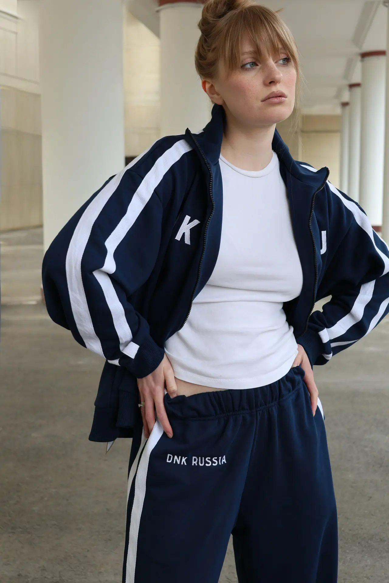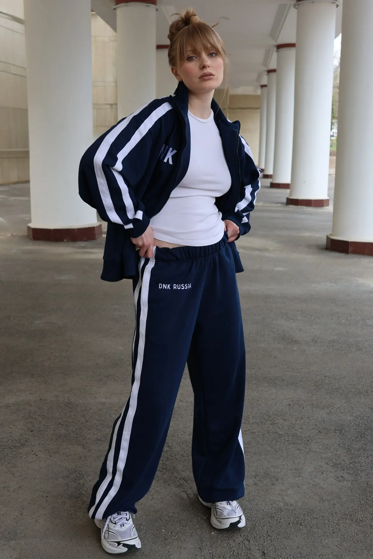 Костюм выполнен из футера трехниточного. Олимпийка на молнии свободного кроя с воротником-стойкой, опущенной линией плеч и объемными рукавами с манжетами. На рукавах двойные лампасы, на груди принт DNK RUS, сзади — фирменная нашивка DNK. Прямые спортивные брюки, при желании низ штанин можно затянуть, превратив их в джоггеры. На эластичной резинке на поясе с карманами и двойными лампасами по бокам.