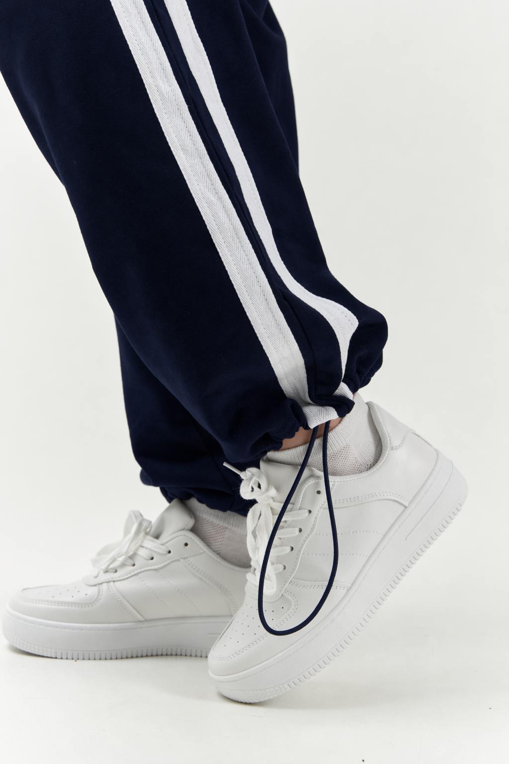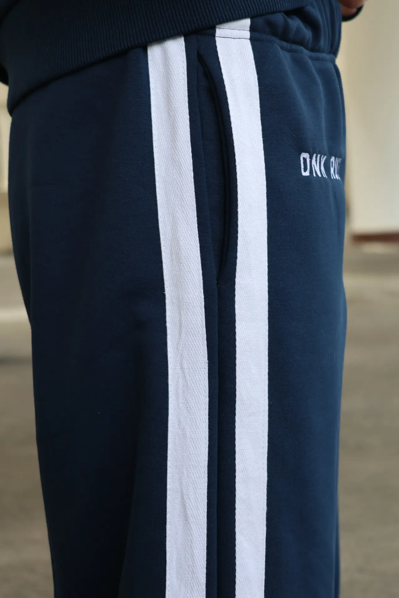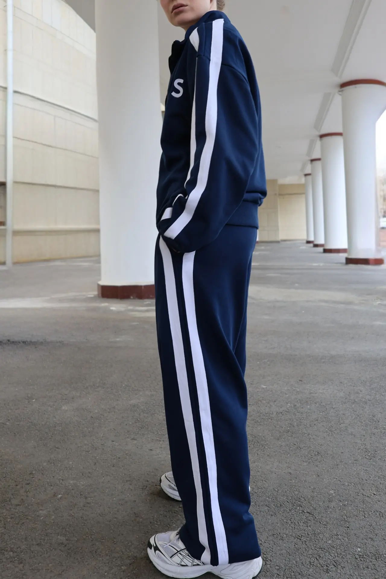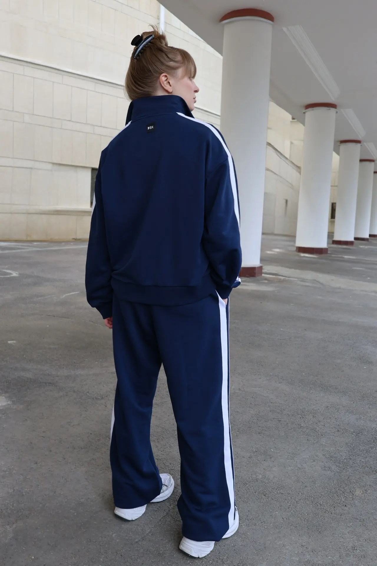 Костюм выполнен из футера трехниточного. Олимпийка на молнии свободного кроя с воротником-стойкой, опущенной линией плеч и объемными рукавами с манжетами. На рукавах двойные лампасы, на груди принт DNK RUS, сзади — фирменная нашивка DNK. Прямые спортивные брюки, при желании низ штанин можно затянуть, превратив их в джоггеры. На эластичной резинке на поясе с карманами и двойными лампасами по бокам.
