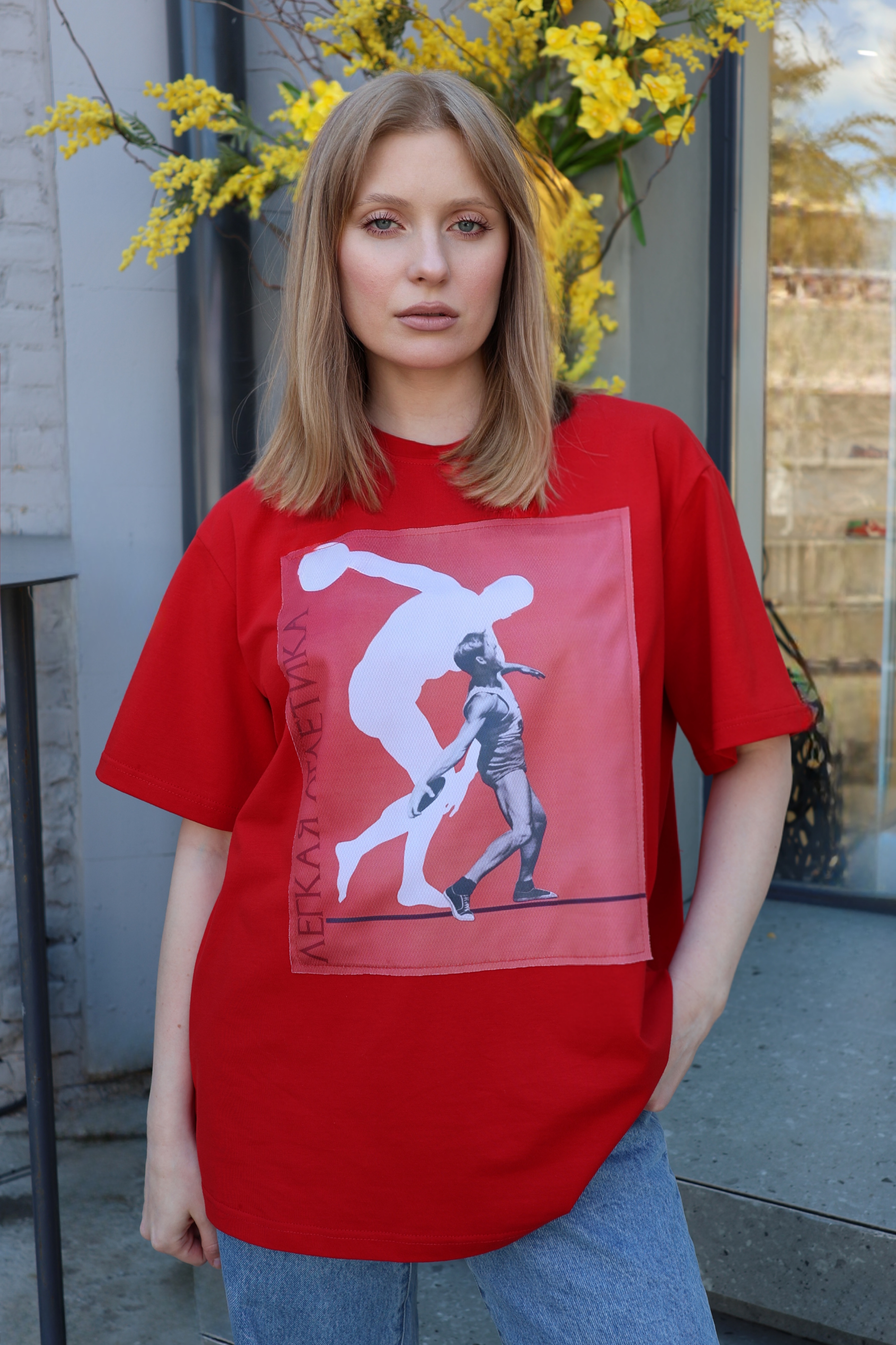 Футболка свободного кроя. Круглая горловина, опущенная линия плеч. На груди расположен авторская нашивка.
