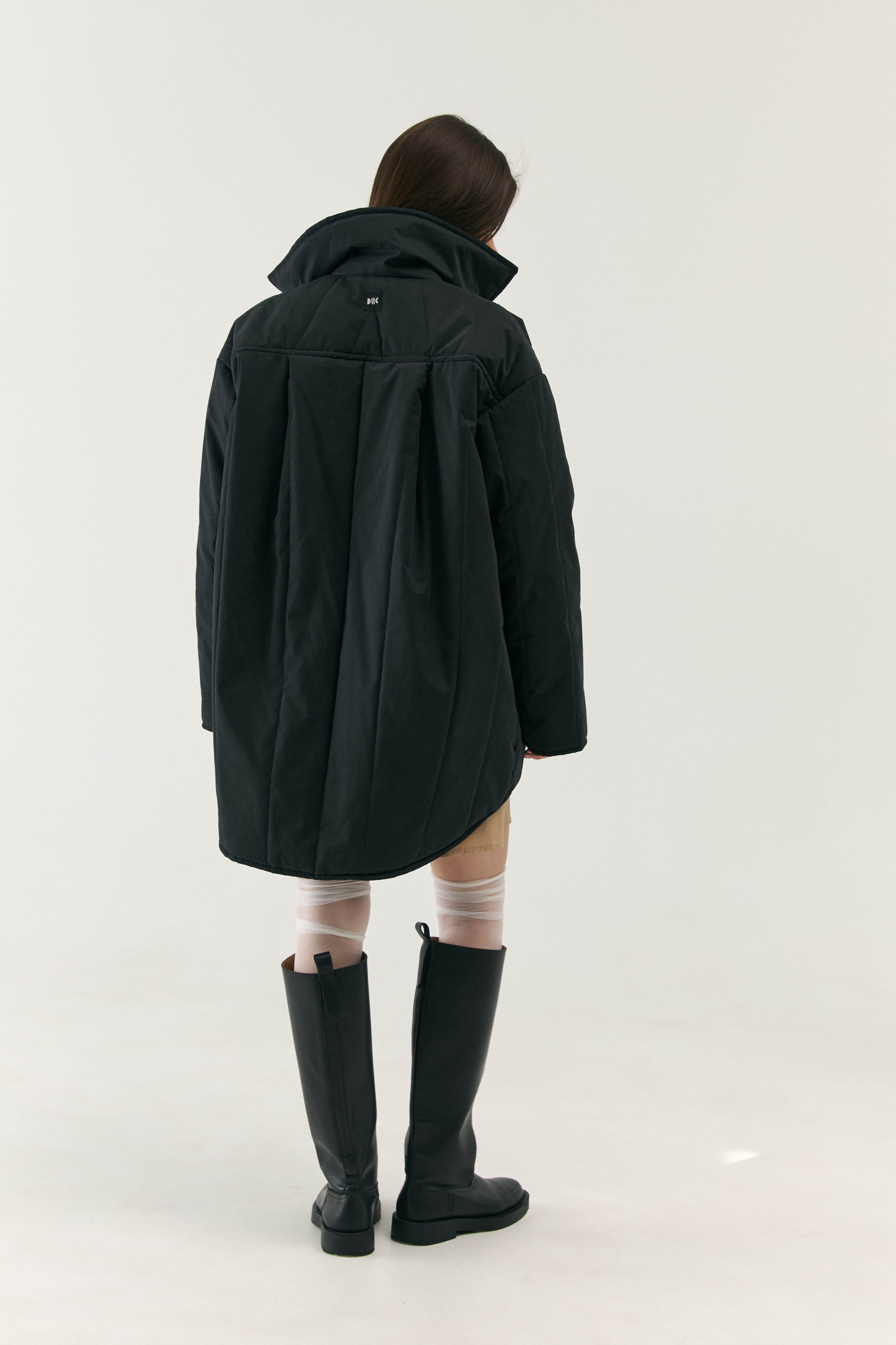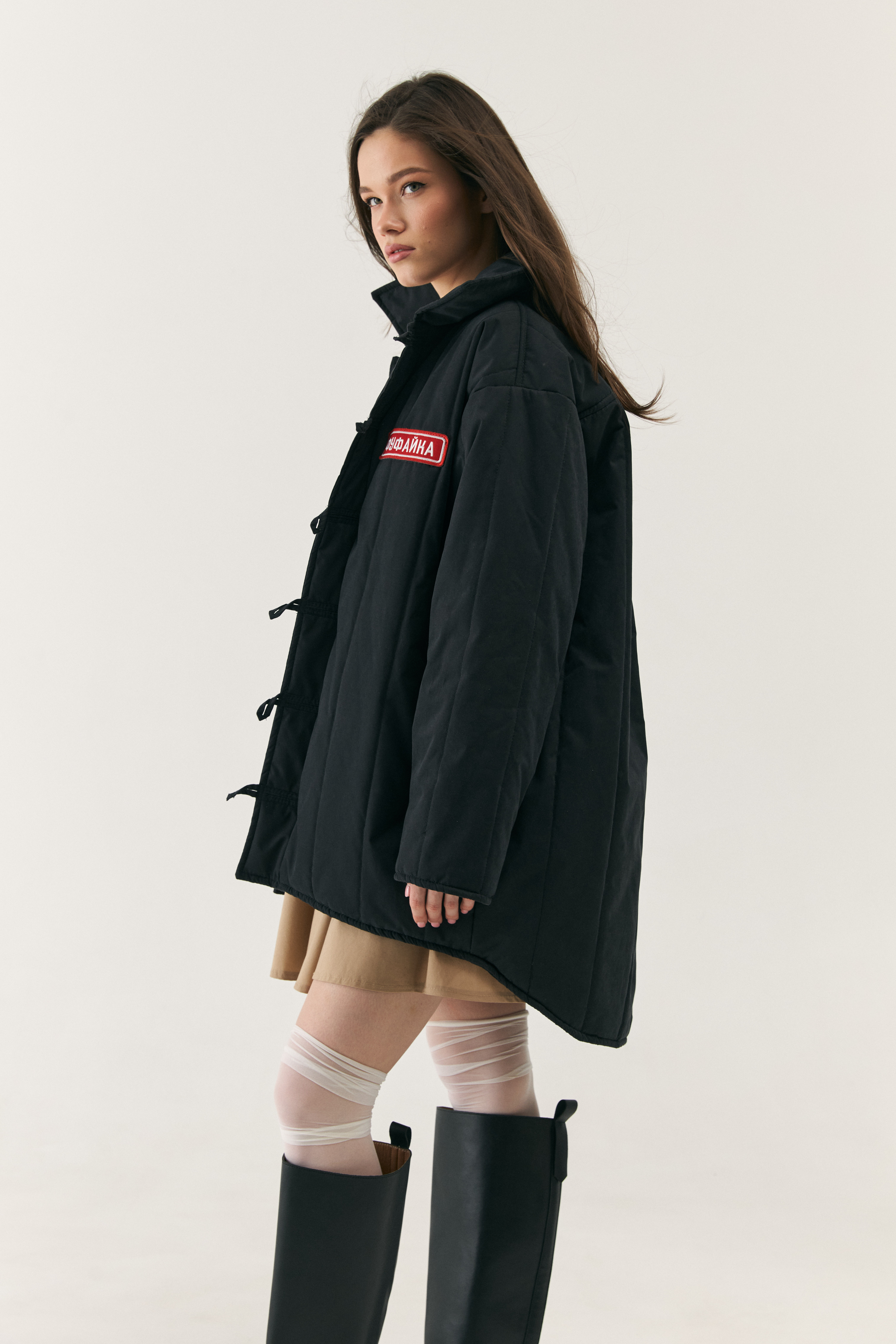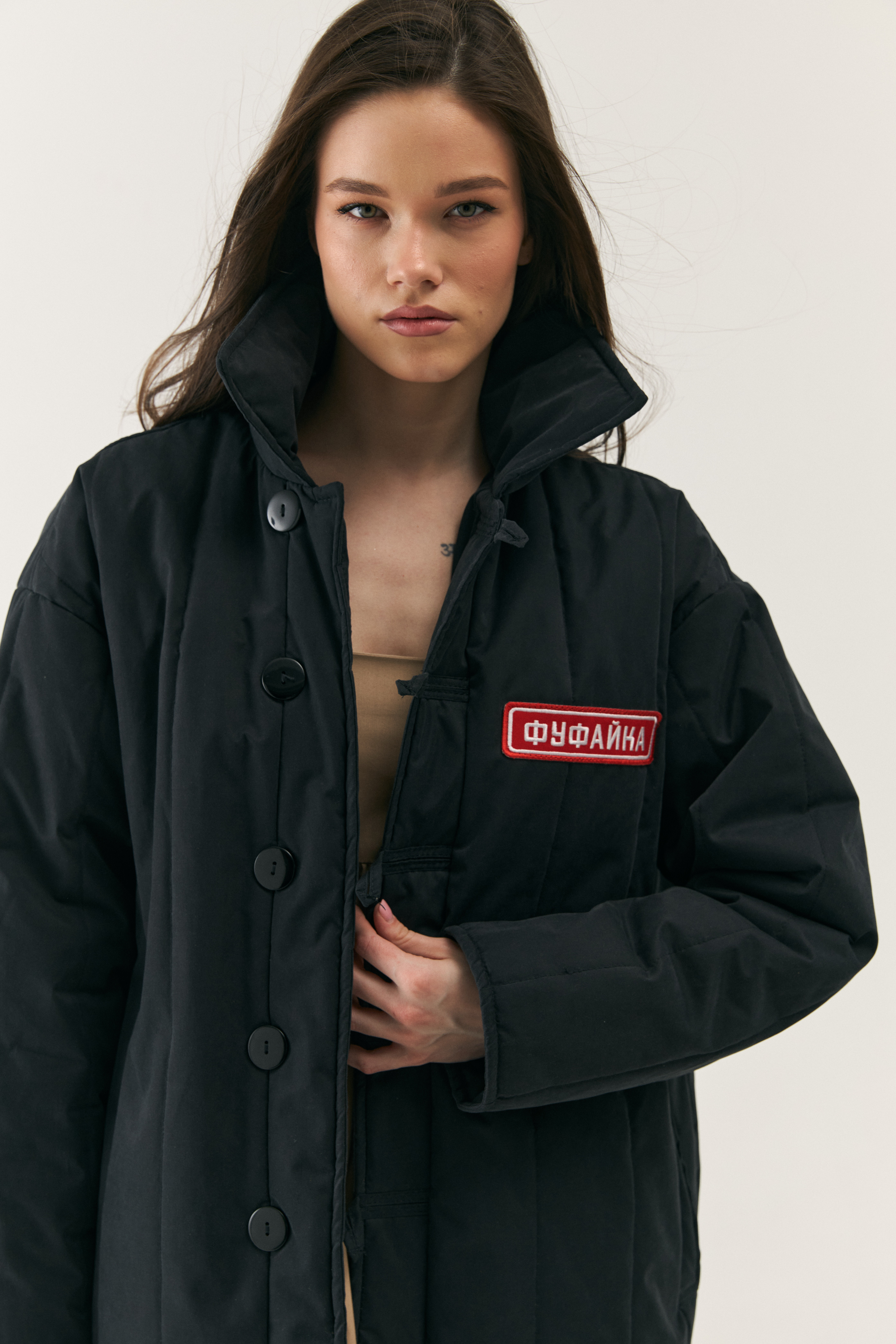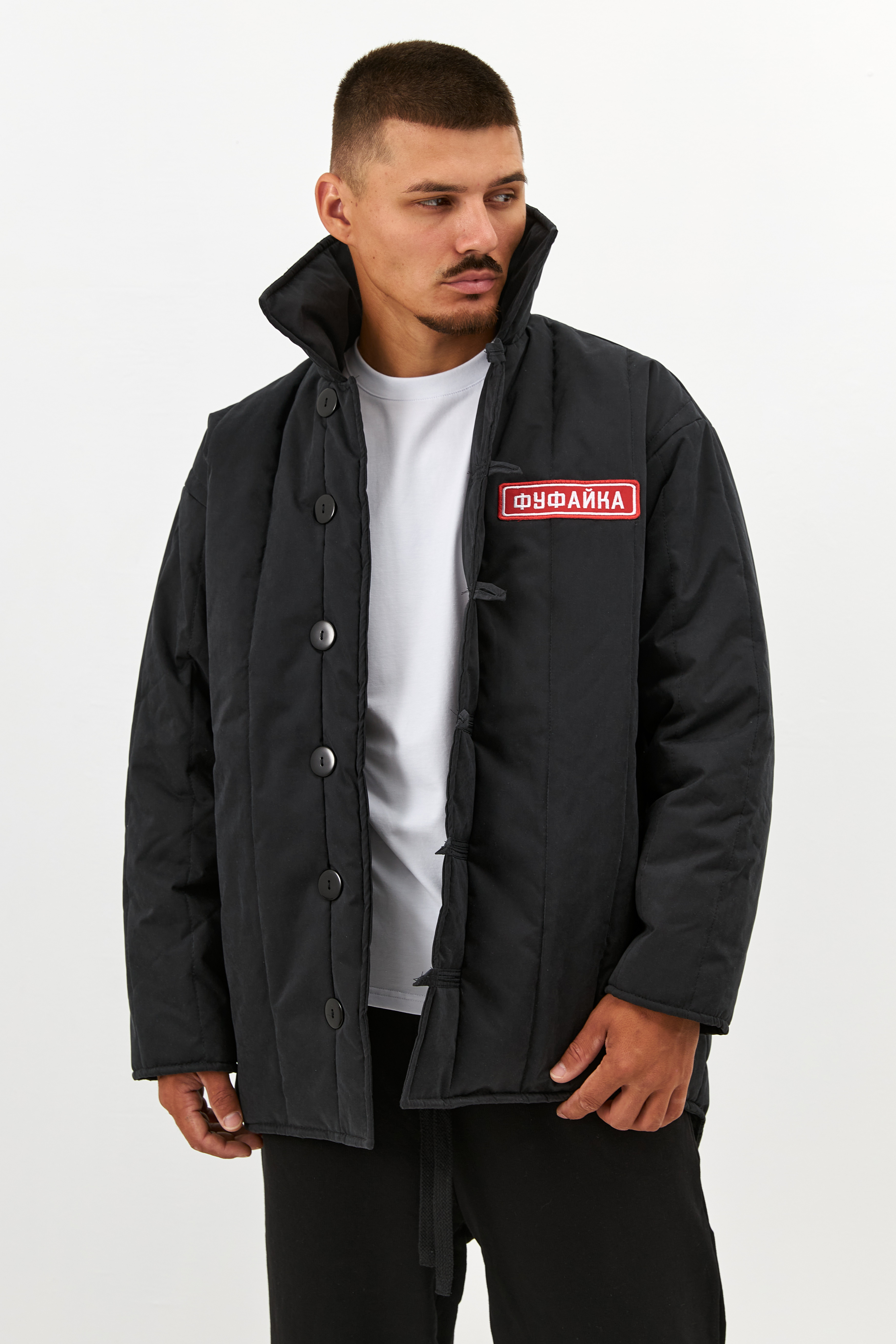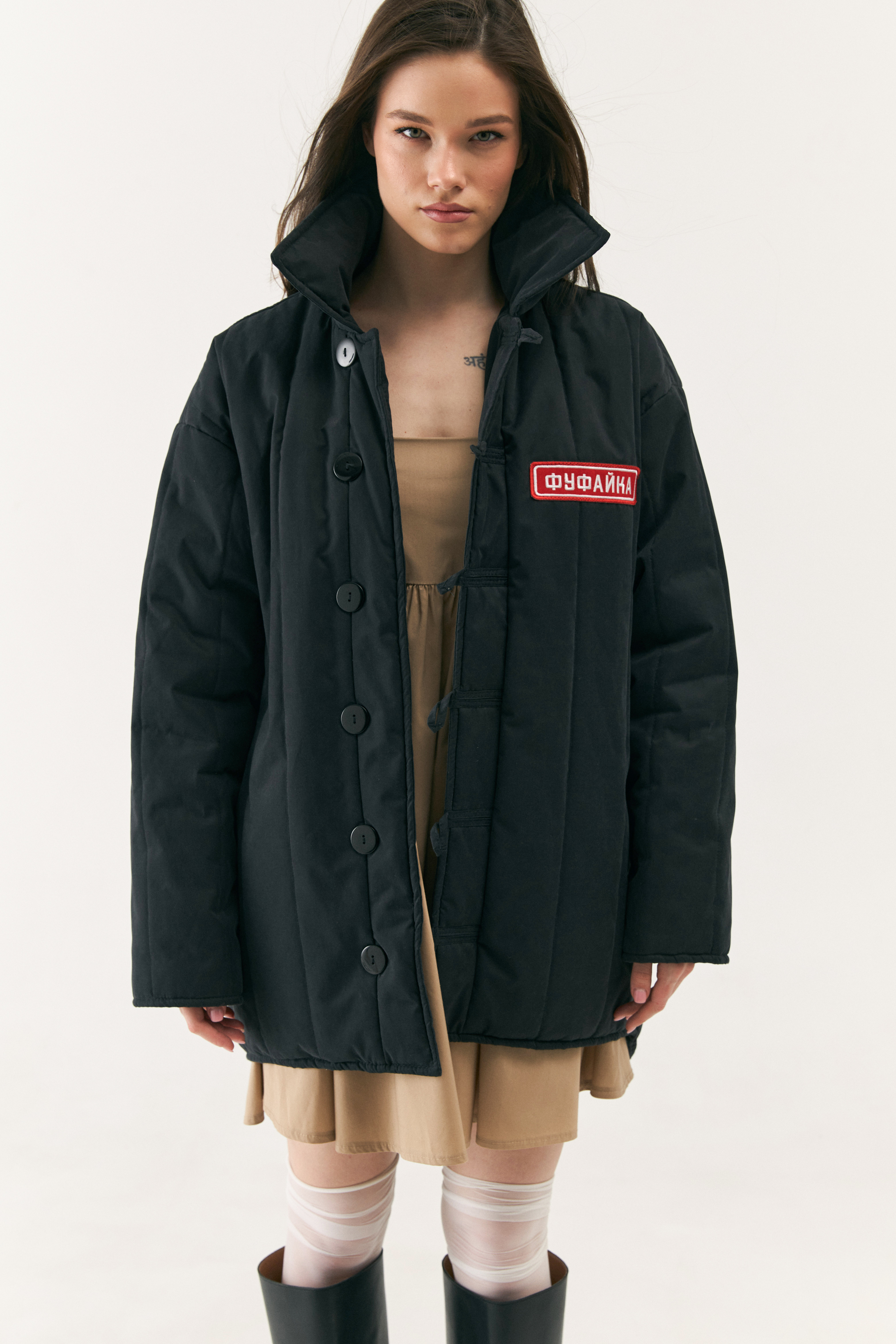 Фуфайка стёганая, свободного кроя. Высокий отложной воротник. Опущенная линия плеч. Прямые рукава. Два втачных кармана. Застегивается на пуговицы. Слева на груди — дизайнерская нашивка ФУФАЙКА. Сзади под воротником — фирменная нашивка DNK.