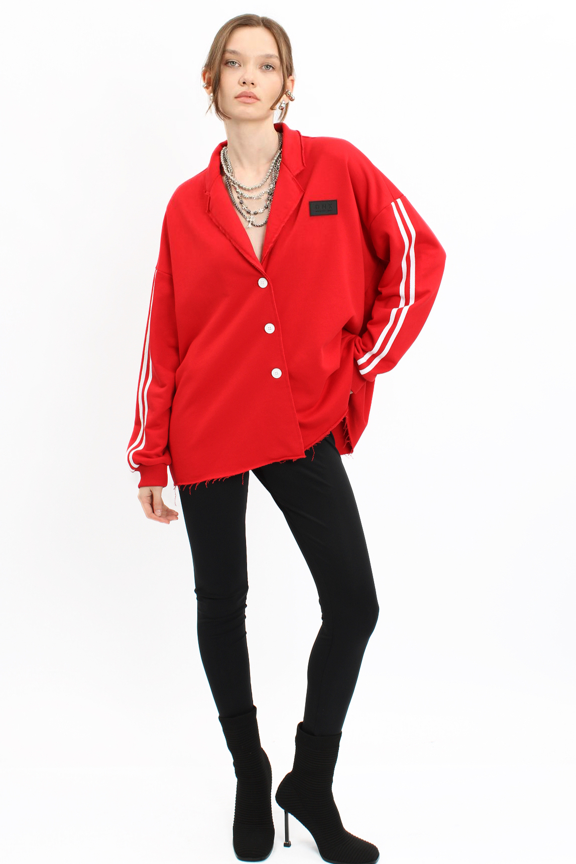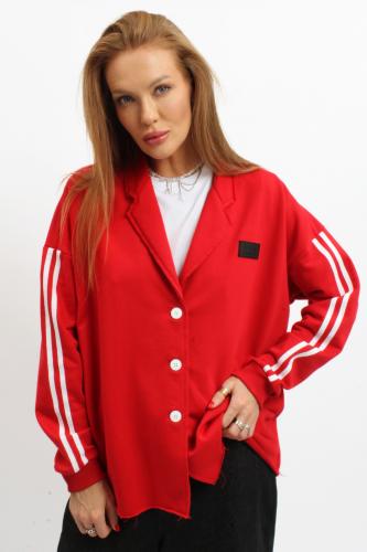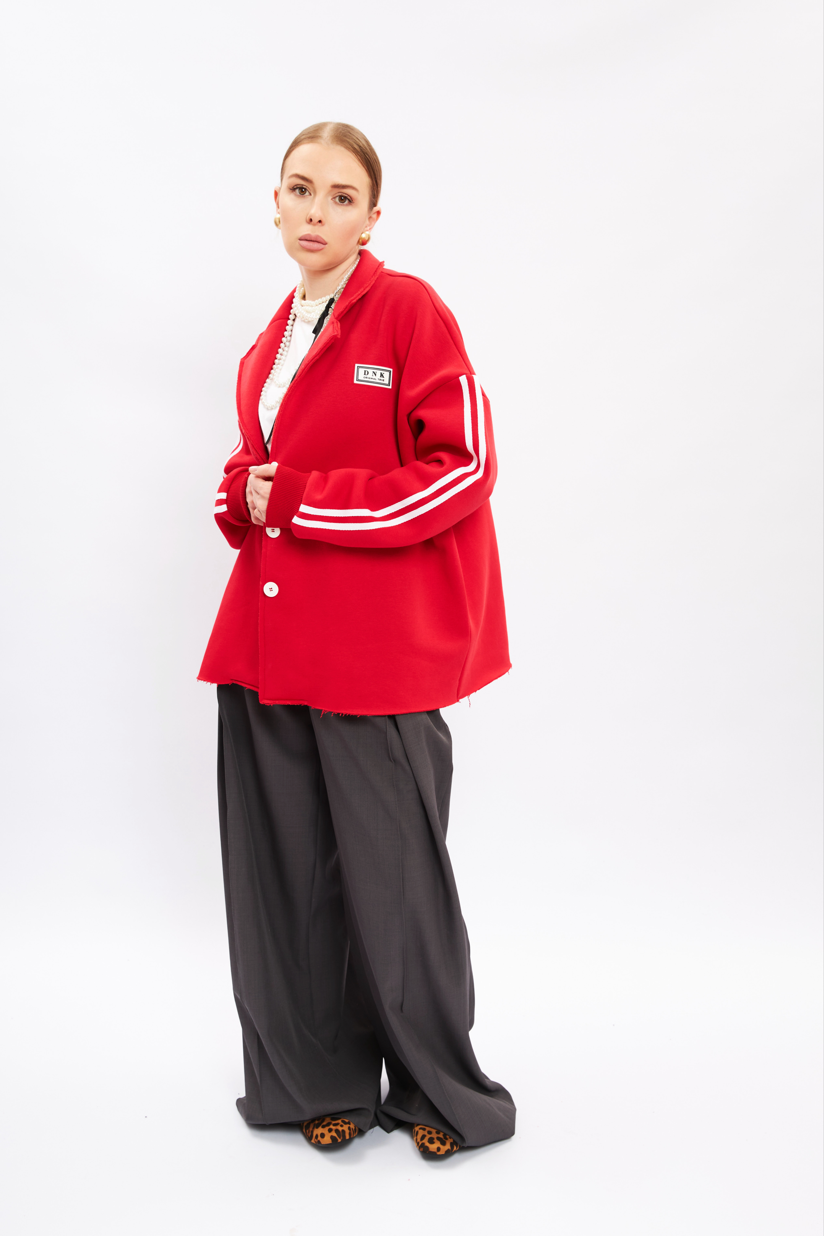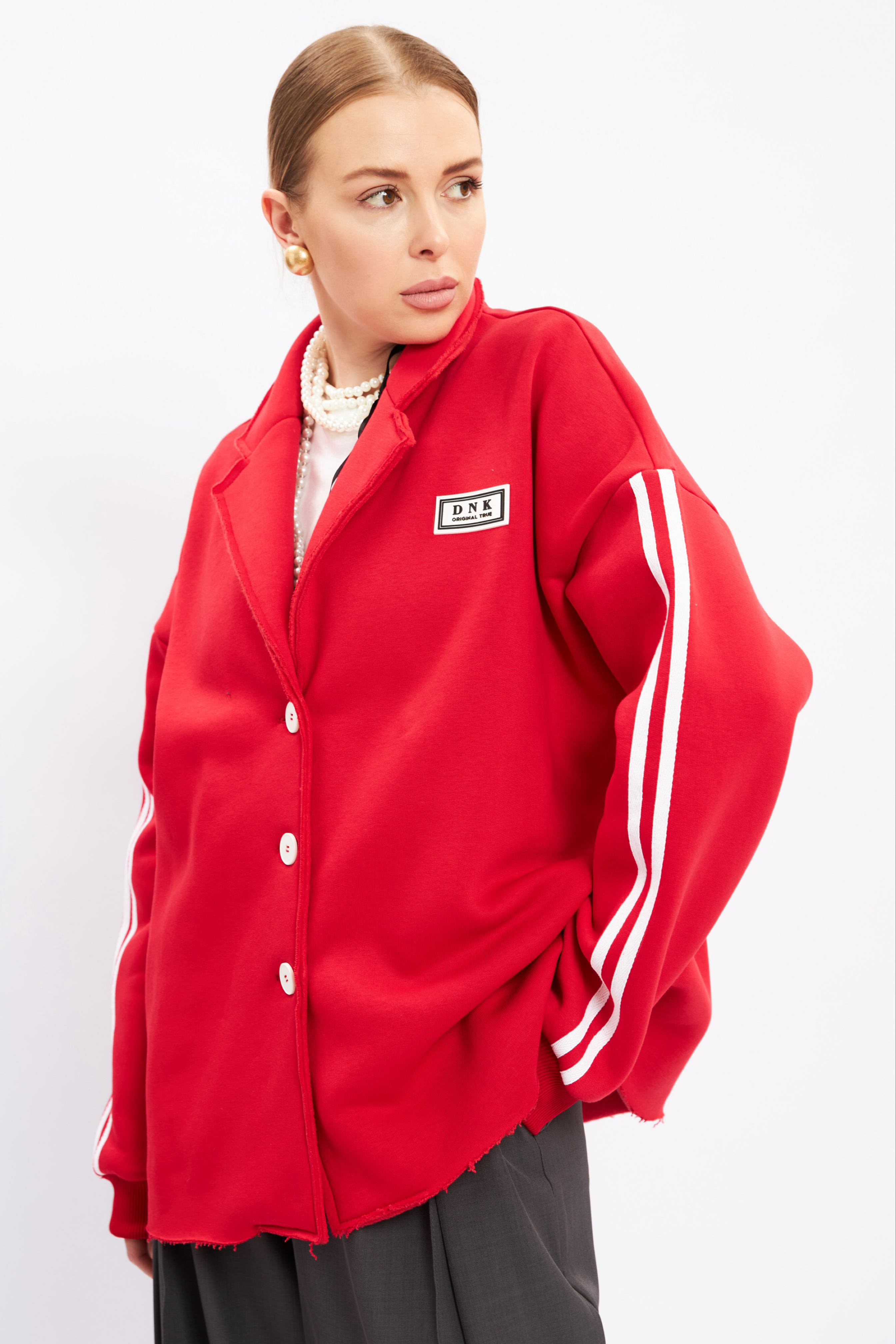Пиджак свободного кроя. Отложной воротник с лацканами. Воротник с эффектом необработанного края. Опущенная линия плеч. Рукава с эластичными манжетами в рубчик. Рукава оформлены двойными лампасами. Пиджак застегивается на пуговицы. Слева на груди прорезиненная нашивка DNK. Сзади - фирменная нашивка DNK. Пиджак выполнен из футера 3-х нитки, который удерживает тепло, не перегревая тело.