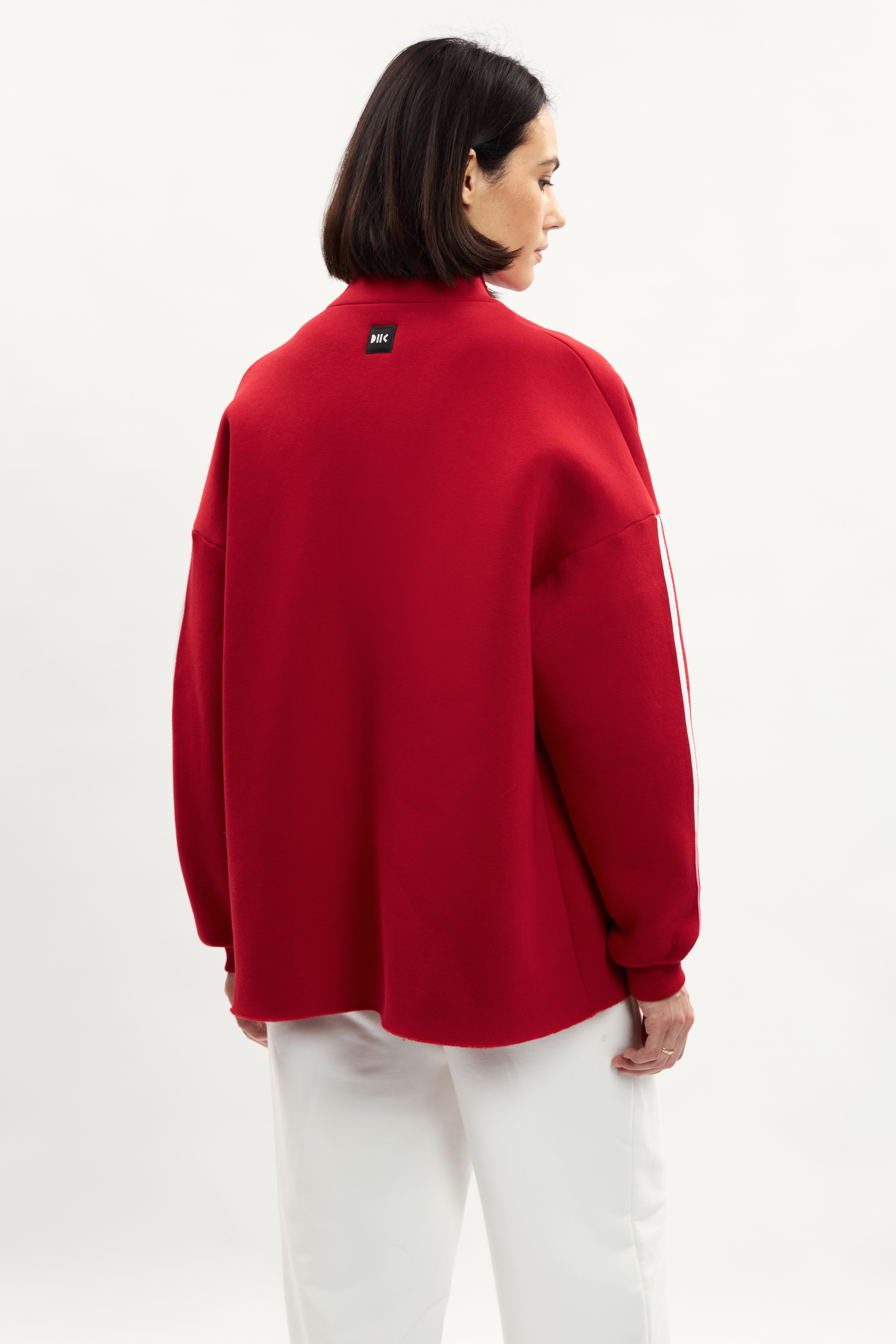 Пиджак свободного кроя. Отложной воротник с лацканами. Воротник с эффектом необработанного края. Опущенная линия плеч. Рукава с эластичными манжетами в рубчик. Рукава оформлены двойными лампасами. Пиджак застегивается на пуговицы. Слева на груди прорезиненная нашивка DNK. Сзади - фирменная нашивка DNK. Пиджак выполнен из футера 3-х нитки с начесом.
