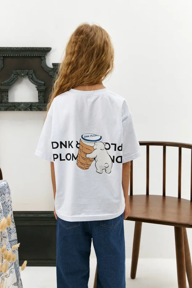 Футболка свободного кроя. Круглая горловина в рубчик. Опущенная линия плеч. На спине - крупный авторский принт ПЛОМБИР.